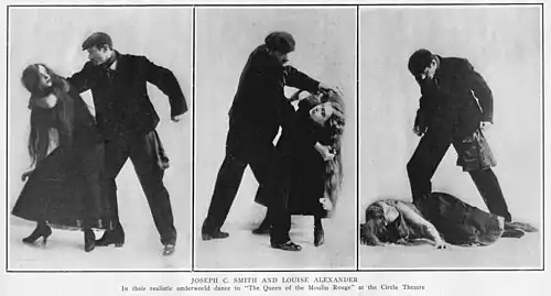 The French Apache dance came into theatrical prominence in July 1908 when it was danced by Mistinguett and Max Dearly in Revue de Moulin, presented at the Moulin Rouge in Paris.[8][9] In October 1908 the dance became a London hit when danced as "Danse des Apaches" by Beatrice Collier and Fred Farren as part of the Music Hall ballet A Day in Paris.[10] In America the first major Apache dance presentation was titled "The Underworld Dance", performed by Louise Alexander and Joseph C. Smith in the hit musical comedy-drama The Queen of the Moulin Rouge,[11] which opened in New York on December 7, 1908.