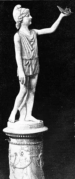 Two of her marble pieces have literary origins: Ayacanora is a life-size statue of the Indian heroine of Charles Kingsley's 1855 novel Westward Ho!, while The Origin of the Harp refers to a poem of the same title by the Irish poet Thomas Moore.[8] Another marble work, The Rhodian Boy is an homage to Classical sculpture.