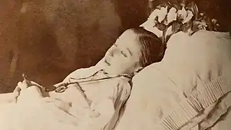 In February 1924, Louise suffered from acute circulatory problems suddenly aggravated by a double congestion.[94] In the early afternoon of Saturday 1 March, she received a visit from a friend, Julius Fritz, who noticed that she was dying. Fritz set out to find a priest to administer the last rites to her, but when he returned with the clergyman, the two men could only note Louise's death at 2 p.m. in the afternoon. Three days later, after a very sober funeral ceremony, she was buried in the South Cemetery of Wiesbaden.[95] Absent during the funeral of their relative, the Belgian royal family (who had dispatched their trusted man Baron Auguste Goffinet in their behalf), mourned her for a month.[96]