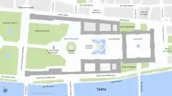 The Louvre Palace is situated on the right bank of the Seine, between the Quai François Mitterrand to its south, the Avenue du Général-Lemonnier to its west (thus named since 1957; formerly rue des Tuileries and Avenue Paul-Déroulède, converted into an underpass in 1987–1989[7]), the Rue de Rivoli to its north, and the Place du Louvre to its east. The complex occupies about 40 hectares with buildings distributed around two main open spaces: the eastern Cour Carrée (square courtyard), which is closed by four wings that form the square of its name, and the central Cour Napoléon, which is open on its western side, beyond the thoroughfare known as Place du Carrousel, towards the Carrousel Garden and the rest of the Tuileries Garden.