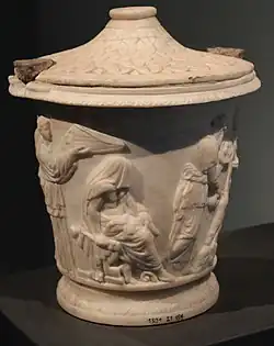 The Lovatelli urn is an early Roman imperial period or 1st century CE marble funerary urn. It is thought to depict Persephone, Demeter and Triptolemus, the triad of the Eleusinian mysteries, however, there are several different competing interpretations about the figures and their meaning in the literature.