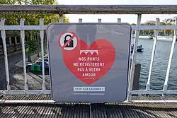 - In France, May 2010, the city of Paris expressed concern over the growing number of love locks on the Pont des Arts, Passerelle Léopold-Sédar-Senghor, and the Pont de l'Archevêché bridges, stating: "they raise problems for the preservation of our architectural heritage". The lovelocks of the Pont des Arts disappeared during the night of 11 May 2010; they had been removed by a student of the nearby École des Beaux-Arts to make a sculpture.[32] Love locks immediately began appearing on the Pont de l'Archevêché[8] and have since spread to at least 11 Seine bridges, the Canal Saint Martin footbridges, and to parks and monuments all over the city. Many tourists mistakenly believe this is a longstanding Parisian tradition, not realizing the practice only migrated into Paris in late 2008 after affecting cities in Italy and Asia. In January 2014, a campaign and petition, No Love Locks™,[33] was founded by two Americans living in Paris in an effort to save the city's historic bridges and monuments from the overwhelming number of locks. The international media attention the campaign received has been credited with the actions begun in the summer and fall of 2014, when the city began seeking alternatives to love locks and asking the public to stop placing locks on Parisian bridges and monuments. On 9 May 2014, the weight of the padlocks on the Pont Des Arts bridge was blamed for the collapse of part of the parapet.[34] The city began an experiment in September 2014 on the Pont des Arts, replacing three panels with a special type of glass that would prevent locks from being attached.[35] On 1 June 2015, the locks were taken down due to the collapsing of the bridge.[36] A website called Passion Locks exists, a tribute to Pont des Arts, where users can send others a virtual love lock.[37]