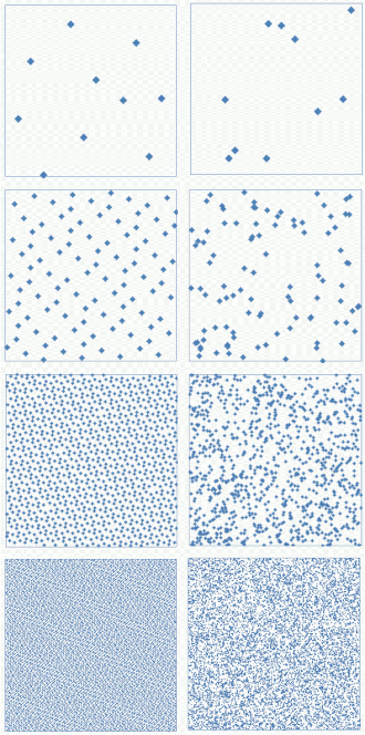 Coverage of the unit square. Left for additive quasirandom numbers with c = 0.5545497..., 0.308517... Right for random numbers. From top to bottom. 10, 100, 1000, 10000 points.