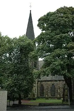 Also a Grade II listed building is the Wesley Memorial Methodist Church.[86] Built on a steeply sloping site on Durham Road in 1882 and opened in January 1883,[87] this church is a "pleasing and individual adaptation of early Gothic design", built in tooled sandstone with Welsh slate roof–tiles.[88] There are two further churches in the suburb. These are Denewell Avenue Church and St Peter's. The former was a presbyterian church - now United Reformed Church, located on the corner of Denewell Avenue and Dryden Road which was formed originally in 1907 when a wood and corrugated iron building was erected on a site purchased for £480.[89] This building was soon demolished and replaced with a new building which opened on Good Friday, 10 April 1914.[90] St Peter's, meanwhile, is a Roman Catholic located on Kells Lane which opened in 1962.[91]