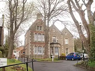 Underhill, at 99 Kells Lane, is a Grade II* listed building.[65] It was the home of Sir Joseph Wilson Swan between 1869 and 1883[66] and was the site of many pioneering experiments in photographic processing and in electricity.[67] Described as "a large, unlovely polychrome villa",[68] Underhill is triple gabled, and built of roughly dressed sandstone, and was the first private residence in the world to be lit by electric light. It later became a school, and is now retirement sheltered housing.[69]
