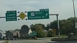 All interchanges were to be renumbered to milepost-based numbers under a project scheduled to start in 2016. However, this project was indefinitely postponed by MassDOT. On November 18, 2019, MassDOT announced that the Lowell Connector's exit numbers would not be changed[11][12] because its exits were so tightly spaced.[13] The entire route is in Middlesex County.