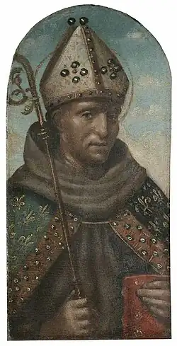 On February 5, 1297, Louis was also consecrated Bishop of Toulouse by Boniface VIII,[11] where his uncle Alphonse had until recently been count, but had died in 1271 leaving no heir. In this ambivalently dynastic and ecclesiastical position, in a territory between Provence and Aquitaine that was essential to Angevin interests, despite the princely standing that had won him this important appointment at the age of about 22, Louis rapidly gained a reputation for serving the poor, feeding the hungry, and ignoring his own needs. After just six months, however, apparently exhausted by his labors, he abandoned the position of Bishop. Shortly thereafter he died at Brignoles of a fever, possibly typhoid, at age 23.[11] Procedures for the canonization of Louis were quickly urged. His case was promoted by Pope Clement V in 1307, and he was canonized by John XXII on April 7, 1317[12] with the bull Sol oriens.[13]