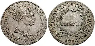 | FELICE ED ELISA PP DI LUCCA E PIOMBINO. Jugate busts of Elisa and Felice Pasquale Baccocchi | PRINCIPATO DI LUCCA E PIOMBINO. 1 FRANCO in two lines across field; all within wreath, 1806 in exergue. |
