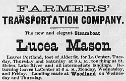 - ^ a b "Farmers' Transportation Company — The new and elegant Steamboat Lucea Mason …", The Columbian (advertisement), vol. 3, no. 39, St. Helens, OR: E.G. Adams, 2, col.4, May 4, 1883