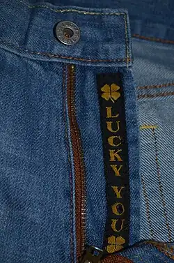 All of the products sold by Lucky as well as their stores' decorations reflected a bohemian style. Denim is the major selling point of the company, making up about 60% of business. All Lucky Brand Jeans have two four-leaf clovers with the phrase "LUCKY YOU" stitched onto the outside of the fly shield. This has become a trademark of their denim line, which is made up of a wide variety of fits and washing.