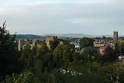 The town and castle viewed from the Whitcliffe, looking northeast; Brown Clee Hill looms in the distance.