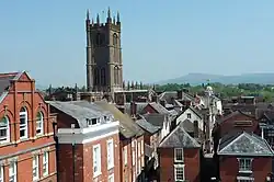 This prosperity is expressed in stone masonry, wood carvings and stained-glass at St. Laurence's parish church; effectively a wool church, it is the largest in Shropshire and a member of the Greater Churches Group. Despite the presence of some Decorated work it is largely Perpendicular in style.[34] Its size and grandeur has given it the nickname "the cathedral of the Marches", and from 1981 to 2020 there was a suffragan Bishop of Ludlow.[35]