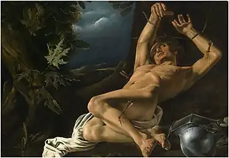 Other than the copies after Caravaggio made after 1606 such as Judith Beheading Holofernes (1607), there are almost no known paintings by Finson before 1610. The signed but not dated Venus and Cupid with an unlikely couple (At Dorotheum on 13 October 2010 in Vienna, lot 352) was likely made in Italy not long after his arrival in Italy and before his exposure to the naturalism of Caravaggio. It shows that at this time Finson was still influenced by the Mannerist school of painting at the court of Rudolph II in Prague, with its preference for exploring erotic motives as well as by the Mannerist style of Antwerp painters such as Jacob de Backer.[5] A Saint John the Baptist preparing himself for his martyrdom in a private collection was attributed to Finson in 2019 and is dated to approximately 1607. It shows Finson's confrontation with the work of Caravaggio. The painting offers an original interpretation of the subject. The foreground is dominated by the nude torso of the saint, shown in a submissive pose a few moments before his beheading. On the left are the heads of Salome and the old maid, who is close to the old maid in Caravaggio's File:Salome with the Head of John the Baptist-Caravaggio in the National Gallery in London.[12] A Caravaggesque painting of the Martyrdom of Saint Sebastian (Parish church of Rougiers, France) was previously dated 1615 but has now been dated 1610. This would place it in the Italian period of the artist.[5][12]
