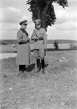 In a June 1938 General Staff study, Beck concluded that Germany could defeat Czechoslovakia but that to do so would leave western Germany empty of troops, which could allow the French to seize the Rhineland with little difficulty.[36] Beck maintained that Czechoslovak defences were very formidable, Prague could mobilise at least 38 divisions and at least 30 German divisions would be needed to break through, which required a campaign of at least three weeks.[31] Beck concluded that Hitler's assumptions about a limited war in 1938 were mistaken.[37] In July 1938, upon being shown Beck's 5 May 1938 memorandum opposing Fall Grün by Brauchitsch, Hitler called Beck's arguments "kindische Kräfteberechnungen" ("childish calculations").[38] In another memorandum of July 1938, Beck contended that a war against Czechoslovakia, France and Britain would end in Germany's defeat and urged Hitler to postpone his plans for aggression until Germany was strong enough for such a war.[39] In late July 1938, Erich von Manstein, a leading protégé of Beck's, wrote to his mentor urging him to stay at his post and to place his faith in Hitler.[40] On 29 July, Beck wrote a memorandum stating the German Army had the duty to prepare for possible wars with foreign enemies and "for an internal conflict which need only take place in Berlin".[41] The 29 July memo is normally considered to be the start of Beck's efforts to overthrow the Nazi regime.[41]