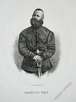 Adolfo Luigi Wolff was born in Augsburg, the son of Ludwig Alexander Wolff and Apollonia von Megenauer. The precise dates of his birth and death are uncertain, but he was probably alive between 1810 and 1875. In the 1830s he joined the French Foreign Legion and fought with distinction in the French conquest of Algeria (1830–47). Before 1849 he served in the Papal army. In 1848–1849 he participated in the Italian Revolution, and in 1856 he fought in the Crimean War as part of an Anglo-Italian contingent. During his adventurous youth, Wolff became a partisan of the Italian Risorgimento and a champion of Italian unification. In addition to nationalist and democratic ideas, he was influenced by utopian socialist doctrines. He became an associate of Giuseppe Mazzini and served as Mazzini's secretary from 1860 to 1870. In 1860–1862, Wolff fought with Giuseppe Garibaldi's troops in several campaigns. When he was not away fighting somewhere, Wolff usually resided in London. In the early 1860s he helped organise an association of Italian workers in London. In 1864, at Mazzini's suggestion, Wolff served as one of the Italian delegates to the newly founded First International. In 1864–1865, he served on its General Council. He was involved in drafting the International's rules and statutes, much to the dismay of Karl Marx, who deplored Mazzini's influence.[1] (Marx eventually wrote the rules adopted by the International.) In 1865, Wolff withdrew from the General Council of the International. In 1865 he was imprisoned in Alexandria. In 1866 he volunteered once again for Garibaldi's forces and fought in the third Italian war of independence. He fought in the battle of Ponte Caffaro on 25 June and in the battle of Monte Suello on 3 July 1866. Wolff attained the rank of colonel and was given the medal of valour after Italy achieved her independence. However, in 1871, after the fall of the Second French Empire, documents found in Paris apparently proved that Wolff had been a paid informer of the imperial police of Napoléon III. This damaged Wolff's reputation among Italian nationalists, who never forgave Napoléon III for his attack on the Roman revolutionaries in 1849, and among socialists and trade unionists, who remembered the persecution of their French comrades. Wolff disappeared after this and was not heard from again.