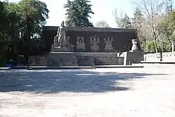 His success in United States brought him back to Mexico, receiving commissions for monumental works. The first of these was El llamado de al revolución in stone, carved between 1932 and 1934. The next in a similar technique, was El esclavo, which has since been lost.[2][3] Later works include the reliefs for the Benemérita Escuela Nacional de Maestros,[6] the Monumento a los defensores de la ciudad de Puebla (1943),[3] the Monumento a la Madre in Parque Sullivan (1948) the Nezahualcoyotl Fountain in Chapultepec Park, the pórtico for the open air theater of the Plaza Cívica of the Unidad Independencia house complex and the Tigres y Águilas sculpture at the Centro Medico Nacional of IMSS(1963). He also created sculptures for cities such as Xalapa and Acapulco.[2][5]