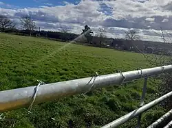 Letocetum lost its public buildings near the end of the 3rd century; the bath-house and mansio were destroyed by fire.[20] Around this time, very solid defences were built which did not include the bath-house or mansio sites. The reason the bath-house and mansio were abandoned can not be determined but the reason was probably economic.[20] Other mansio sites around Britain appear to have been abandoned at this time. This did not imply an end to the posting service at Letocetum, it may have been a less costly reorganisation.[20] The late defences were built in about 300 CE astride Watling Street, approximately 150 metres (490 ft) east of the mansio site.[21] The defences consisted of a stone wall about 2.7 metres (8.9 ft) thick, fronted by three ditches and with a contemporary turf rampart to the rear, the area within the walls was 2.1 hectares (5.2 acres).[21] The northern and western sides were identified and sectioned in 1964 and the foundations of a wall at the south west corner were uncovered. On the western side a section of wall was found still standing 1.5 metres (4.9 ft) high above shallow foundations but below the ploughed soil. The wall is believed to have been built within the period 275–325 CE.[21]