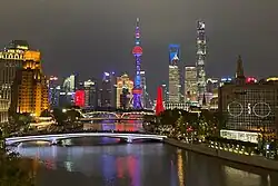 Lujiazui (Chinese: 陆家嘴; pinyin: Lùjiāzuǐ, Wu Chinese pronunciation: [lʊʔ˩ ka̱˨ t͡sz̩˧]) is a locality in Shanghai, a peninsula formed by a bend in the Huangpu River. Since the early 1990s, Lujiazui has been developed specifically as a new financial district of Shanghai. The decision to earmark Lujiazui for this purpose reflects its location: it is located on the east side of the Huangpu River in Pudong, and sits directly across the river from the old financial and business district of the Bund.