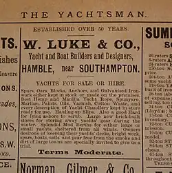 There are at least three members of the Luke family known as boatbuilders: W. S. (Walter Smith) Luke (1844–1904), and his sons Walter G. Luke (born 1868) and Albert R. Luke (born 1875). The name of the yard changed over the years from W. S. Luke to W. G. Luke & Co (1895), to Hamble River Luke & Co. Ltd., and finally Luke Bros.