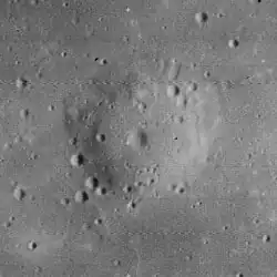 Oblique view of lunar dome near Messier in Mare Fecunditatis. Note dark 'halo' deposits. The crater left of center is unrelated (formed after the dome). -