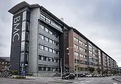 The university's facilities are mainly located in the small city of Lund in Scania, about 15 km away from central Malmö and 50 km from Copenhagen. The large student and staff population makes an impact on the city, effectively making it a university town. Over a hundred university buildings[17] scatter around town, most of them in an area covering more than 1 km2, stretching towards the north-east from Lundagård park in the very centre of town. Buildings in and around Lundagård include the main building, Kungshuset, the Historical Museum and the Academic Society's headquarters. The main library building is located in a park 400 meters to the north, followed by the large hospital complex.