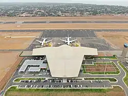 Until 1949, an airstrip at Waterloo served the city of Freetown. Because of subsidence of the runway and the proximity of the hills, the Government decided in 1947 to abandon Waterloo and make Lungi, a British Royal Air Force base, the airport for Freetown.[2] Waterloo airfield was closed in June 1949.[3] The senior architect of the Public Works Department, Robin Halliday Macartney, supplied a draft plan for the terminal building,[4] which then became the responsibility of the airport engineer A. E. Pugh. The plans had to be altered considerably to comply with new medical regulations[5] and work did not start before 1953. The control tower had been built in 1952. The new terminal building, finished in 1955, soon proved to be too small, and in 1960 it was decided to make Lungi a modern international airport.[6] A new terminal building was erected to designs by Nickson & Borys[7] and was officially opened on June 25, 1964. The building was expanded for the 1980 OAU summit.[8]