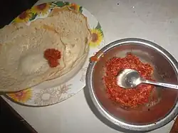 Lunumiris (Sinhala:ලුණු මිරිස් [lunu-miris] means salt and chillies in Sinhalese. Traditionally it is made with ground chillies and salt mixed together into a paste. Some also refer it as katta sambol, but katta sambol is a different condiment. Katta sambol (Sinhala:කට්ට සම්බෝල [kaṭṭa sambōla]) is a spicy Sri Lankan sambal served as a condiment. It consists of chili pepper, shallots, Maldives fish, sea salt, black pepper, and lime juice, usually ground with a mortar and pestle or a grind stone.