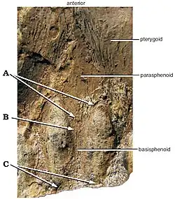 It is based on a single autapomorphy, a broad triangular parasphenoid cultriform process that is as long as the posterior interpterygoid vacuities, and also on a unique character combination.[1]