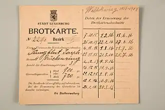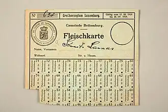 The most pressing concern of the Luxembourgish government was that of food supply.[34] The war had made importation of food an impossibility, and the needs of the German occupiers were inevitably placed before those of the Luxembourgish people.[35] To slow the food supply's diminishment, Michel Welter, the Director-General for both agriculture and commerce, banned the export of food from Luxembourg.[36] Furthermore, the government introduced rationing and price controls to counteract the soaring demand and to make food more affordable for poorer Luxembourgers. However, the measures did not have the desired effect. Increasing numbers of Luxembourgers turned to the black market,[34] and, to the consternation of the Luxembourgish government, the German army of occupation seemed to do little to help. Moreover, the government accused Germany of aiding the development of the black market by refusing to enforce regulations, and even of smuggling goods themselves.[35]
