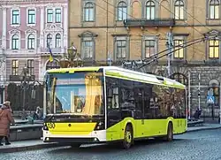 The Lviv trolleybus (Ukrainian: Львівський тролейбус, translit.: L’vivs’kyi troleibus) is a trolleybus system in Lviv, Ukraine. The trolleybus network is operated by Lvivelectrotrans - a municipal enterprise, that is the operator of trams and trolleybuses in the city. LET is owned by the Lviv City Council. The length of the contact network is 136 km (01.2023), and the length of the route network is 169 km (01.2021).[1] As of 2021, 24,678,300 paid passengers (including 2,785,623 students) used trams and trolleybuses. In 2021, trolleybuses performed 3.29 million kilometers of transportation work (vehicle-km). In January 2024, 900,744[2] passengers were transported by trolleybus routes.