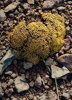 Lyallia kerguelensis is a perennial that forms round cushions, usually 20–40 centimeters across, but occasionally up to 1 meter in diameter.[1] Individual cushions have a mean diameter of 12.79 cm and mean height of 6.06 cm.[2] The plants have a extensive root system with a large main root and many fine branching roots.[3] Plants can live for at least 16 years.[1]