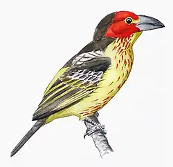 Vieillot's barbet (Lybius vieilloti) is a small bird in the family Lybiidae. Barbets are a group of near passerine birds with a pantropical distribution which get their name from the bristles which fringe their heavy bills. This bird is named after the French ornithologist Louis Pierre Vieillot.[3]