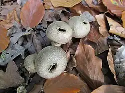 The specific epithet perlatum is Latin for "widespread".[10] It is commonly known as the common puffball, the gem-studded puffball[11] (or gemmed puffball),[12] the warted puffball,[10] or the devil's snuff-box;[13] Samuel Frederick Gray called it the pearly puff-ball in his 1821 work A Natural Arrangement of British Plants.[14] Because some indigenous peoples believed that the spores caused blindness, the puffball has some local names such as "blindman's bellows" and "no-eyes".[15]