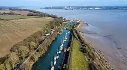 In the 1960s imported wood was still being brought in by barge from Avonmouth.[2] It remained in commercial use until the 1980s. The entrance to the canal consists of an outer tidal gate opening into a wide basin. From there a lock opens into the one-mile canal cut. Immediately above the lock, a pair of gates points the other way as protection against a high tidal flood in the estuary. There is one swing bridge across the canal.
