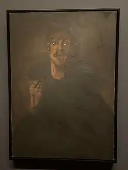 Yiadom-Boakye's work consists mostly of painted portraits of imaginary Black subjects. Her paintings are predominantly figurative, with raw and muted colors. The characteristic dark palette of her work is known for creating a feeling of stillness that contributes to the timeless nature of her subjects.[14] Her portraits of imaginary individuals feature people reading, lounging, and resting in traditional poses. She brings to the depiction of her subjects contemplative facial expressions and relaxed gestures, making their posture and mood relatable to many viewers. Commentators have attributed some of the acclaim of Yiadom-Boakye's work to this relatability. She strives to keep her subjects from being associated with a particular decade or time; many of her art pieces depict figures/people of African descent. This results in choices such as not painting shoes on her subjects, as footwear often serves as a time stamp.[15] These figures usually rest in front of ambiguous backgrounds, floating inside monochromatic dark hues. These cryptic, but emotional backdrops remind commentators of old masters such as Velasquez and Degas.[16]