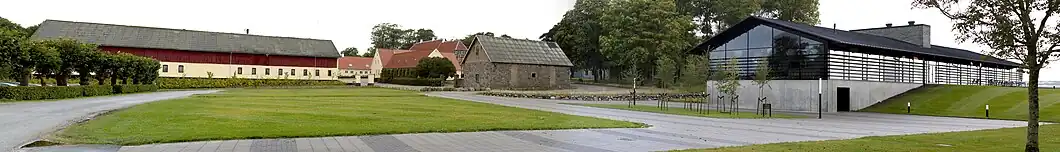 The west building is a well-preserved example of a large half-timbered structure divided between an east building from 1775 and a west building from 1755. The external walls are built of granite boulders and the low and wide barrel vault with groins over the windows are formed by large medieval bricks. Both buildings have wooden cornices, hip roofs, spires and ridge turrets. The east building has a front dormer over the main entrance which is decorated with an architrave. Steep steps lead to the entrance which has wooden pilasters.[3][4]