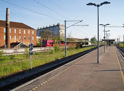 Ryparken station is an S-train railway station serving the district of Østerbro in Copenhagen, Denmark.[1] It serves as an interchange station between the Ring line and Farum radial of Copenhagen's S-train network and is serviced by the B, F, and H lines.[4] The station was originally named Lyngbyvej Station but was renamed to Ryparken Station in 1972.