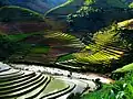 Local farmers needed to develop special water distribution channels to deal with the lack of water and the high altitude topography.[4] In response to this challenge, the Hmong people developed a way to retain water by levelling the land on the mountain in layers, resulting in the rice terrace fields' distinctive look. The terraces stretch across 2,200 hectares of the mountainside as narrow layers of terraces ranging from 1 to 1.5 m (3 to 5 ft) wide.