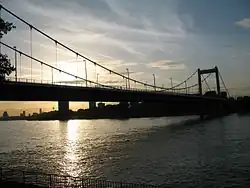 The Mülheim Bridge (German: Mülheimer Brücke [ˈmyːlhaɪmɐ ˌbʁʏkə]; Kölsch: Möllemer Bröck [ˈmø̂ləmɐ ˌbʁø̂k]) in Cologne is a suspension bridge on the river Rhine in western Germany. It has a main span of 315 metres.[1] The bridge was originally completed in 1929. On 14–15 October 1944 an American bomb struck the chamber containing the demolition charges, destroying the bridge.[1] The bridge was rebuilt between 1949 and 1951. It connects the city district Riehl on the west side of the river with Mülheim on the east side, after which the bridge is named.