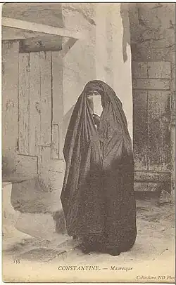 The origin of the M'laya goes back to the 18th century and is connected to the death of Salah Bey who was the Bey of Constantine.[1] Following his tragic death a tradition emerged in Constantine of wearing the M'laya.[1][2] The M'laya is black in colour unlike the haik which is white. The M'laya covers the entire body and is said to have been a symbol of modesty.[3]