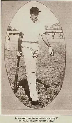 M. Suryanarayan was a stylish right-hand middle order batsman who played off and cover drives in particularly elegant fashion. A stalwart of Madras cricket in the forties and fifties, `Suri' as he was popularly known, played 11 matches for the state in the Ranji Trophy and earned selection for the Indian team for the fifth and final `Test' against the SJOC team at Lucknow in 1953–54. Suryanarayan proved his mettle by scoring two unbeaten half-centuries against bowlers of the class of Frank Worrell, Fazal Mahmood, Amir Elahi, Khan Mohamed, Loxton, Peter Loader, and Jim McConnel. He Captained Madras and Mysore at the highest levels, besides scoring three centuries before lunch in first-class cricket in Madras and Bangalore. He won the All-India University Tennis Doubles title, Partnering Ramanathan Krishnan, and played in the qualifying rounds of the doubles tournament at Wimbledon. He also won several titles in Table tennis and golf in South Indian Competitions.[3]