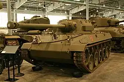 In December 1941, the Ordnance Department issued a requirement for the design of a fast tank destroyer using a Christie suspension, a Wright-Continental R-975 radial aircraft engine, and a 37 mm gun on the chassis of the Light Airborne Tank T9 as the 37 mm Gun Motor Carriage T42.[16] In April 1942, the Army requested that the 37 mm gun be replaced with a 57 mm and a coil spring suspension be substituted for the Christie suspension as the 57 mm Gun Motor Carriage T49, and authorized the construction of two pilot models.[16] The Tank Destroyer Force, meanwhile, concluded that the same 75 mm gun M3 as used on the M4 Sherman medium tank would be better for a tank destroyer. The second pilot T49 was built with the 75 mm gun in an open-topped turret as the 75 mm Gun Motor Carriage T67 and was delivered in November 1942. After testing, it was revealed that a more powerful engine was necessary, and the 76 mm gun M1A1 being developed for the M4 Sherman had also impressed the Tank Destroyer Force. The T67 project was closed in January 1943, and the Ordnance Department directed that six pilot models of the 76 mm Gun Motor Carriage T70 be built with torsion bar suspensions, more powerful engines, new turrets and minor changes to the hull front.[17] What became the M18 originated in Harley Earl's design studio, part of the Buick Motor Division of General Motors. Previously, basic designs for other kinds of vehicles had mostly originated from within the Ordnance Department. Buick's engineers used a torsion bar suspension that provided a steady ride.