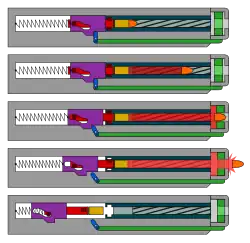 It was gas operated, using a sliding muzzle cup system which was blown forward by the combustion gases while the bullet emerged from the barrel. This ".256 Bang" rifle was a top candidate from 1925 to 1928 for US contracts ultimately won by the M1 Garand. Bang himself demonstrated his own models in US field trials in 1919 and 1927.[1] The Bang rifle was ultimately unsuccessful in US government testing because of its mechanical complexity and susceptibility to gas fouling of the sliding muzzle cup.