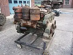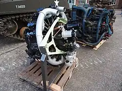 Most Sherman sub-types ran on gasoline. The air-cooled Continental-produced Wright R-975 Whirlwind 9-cylinder radial gasoline engine in the M4 and M4A1 produced 350 or 400 horsepower (260 or 300 kW). The M4A3 used the liquid-cooled 450 hp (340 kW) Ford GAA V8 gasoline engine, and the M4A4 used the liquid-cooled 370 hp (280 kW) 30 cylinder Chrysler A57 multibank gasoline engine. There were also two diesel-engined variants. The M4A2 was powered by a pair of liquid-cooled GMC Detroit Diesel 6–71 two-stroke inline engines,[26] that produced a total of 375 hp (280 kW), while the M4A6 used an RD-1820 (a redesigned Caterpillar D-200A air-cooled radial diesel engine, adapted from Wright Aeronautical's Wright R-1820 Cyclone 9 nine-cylinder radial aircraft engine.[26]) that produced 450 hp (340 kW). A 24-volt electrical system was used in the M4.[5] The M4A2 and M4A4 were mostly supplied to other Allied countries under Lend-Lease.[27]