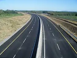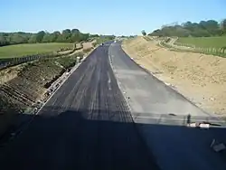 The construction of the Nenagh to Limerick section was slow and difficult. Work on this section began on 7 December 2006 and was initially due to be completed in May 2009.[4] The total length of the scheme is 38 km (24 mi), of which 10 km (6.2 mi) was the upgrading of the single carriageway Nenagh bypass. The road opened in three stages. The Nenagh bypass re-opened to motorway standard on 17 December 2009 and the Nenagh to Birdhill section opened on 1 April 2010. Problems were encountered while constructing the road over two sections of deep bog at Annaholty and Drominboy near Birdhill and this delayed the opening of the Birdhill to Limerick section by over a year. Parts of the road collapsed over the two bogs and the sections were rebuilt and opened on 28 September 2010.[5] This scheme was originally to be built as a high-quality dual carriageway (HQDC), but it was re-designated motorway by Statutory Instrument on 17 July 2008.