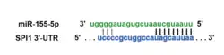 Figure 4. Complementary base-pairing between miR-155-5p and the human SPI1 (spleen focus forming virus proviral integration oncogene)(also known as PU.1) mRNA. The miR-155-5p binding site is located 46–53 base pairs downstream from the SPI1 mRNA stop codon. The requisite "seed sequence" base-pairing is denoted by the bold dashes.