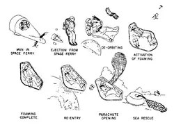 The astronaut would leave the vehicle in a space suit, climb inside the plastic bag, and then fill it with foam.[5] The bag had the shape of a blunt cone, with the astronaut embedded in its base facing away from the apex of the cone. The rocket pack would protrude from the bag and be used to slow the astronaut's orbital speed enough so that he would reenter Earth's atmosphere, and the foam-filled bag would act as insulation during the subsequent aerobraking. Finally, once the astronaut had descended to 30,000 ft (9.1 km) where air was sufficiently dense, the parachute would automatically deploy and slow the astronaut's fall to 17 mph (7.6 m/s). The foam heat shield would serve a final role as cushioning when the astronaut touched down and as a flotation device should they land on water. The radio beacon would guide rescuers.[6]