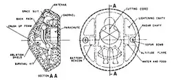 MOOSE, originally an acronym for Man Out Of Space Easiest but later changed to the more professional-sounding Manned Orbital Operations Safety Equipment,[1] was a proposed emergency "bail-out" system capable of bringing a single astronaut safely down from Earth orbit to the planet's surface.[2][3] The design was proposed by General Electric in the early 1960s. The system was quite compact, weighing 200 lb (91 kg) and fitting inside a suitcase-sized container. It consisted of a small twin-nozzle rocket motor sufficient to deorbit the astronaut, a PET film bag 6 ft (1.8 m) long with a flexible 0.25 in (6.4 mm) ablative heat shield on the back, two pressurized canisters to fill it with polyurethane foam, a parachute, radio equipment and a survival kit.[4]