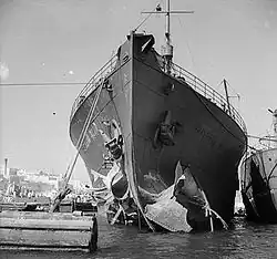 Off Cap Bon on 12 August a Luftwaffe aircraft launched an aerial torpedo at Brisbane Star. It damaged her bow, almost tearing it off, but she stayed afloat.[4] She could make only 3 knots (5.6 km/h), so she rounded Cap Bon and anchored in the Gulf of Hammamet. There the harbour master of Sousse in Vichy French Tunisia boarded the ship, declared her unseaworthy and ordered her to be detained and enter port. Brisbane Star's Master, Captain Frederick Riley, refused and the harbour master eventually withdrew[5] but agreed take ashore one crewman, who had been seriously wounded in the attack, but unfortunately he died shortly afterwards.[6]
