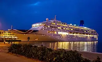 Christened in 1995, by Queen Elizabeth II, Oriana was the first new ship commissioned for P&O Cruises, and the first to be designed specifically for the British cruise market.[7] At 69,153 gross tons, she was one of the largest cruise ships in the world.[8] She was also designed in the style of an ocean liner to facilitate long distance voyages and world cruises. She was the second ship to carry the name Oriana, and was named in tribute to the first Oriana, which served for Orient Line and P&O from 1960 to 1986. After a lengthy campaign, P&O Cruises were permitted to allocate the new Oriana the call sign 'GVSN', which was the same call sign as the first Oriana.[9]